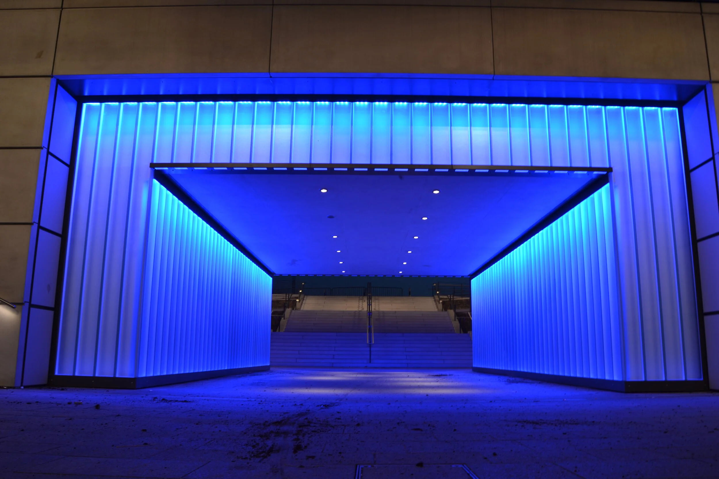Les parois latérales du tunnel et les surfaces visibles à l’entrée du tunnel sont constituées d'éléments en Linit, verre profilé en U, en saillie avec éclairage LED intégré. Le rétroéclairage des parois de verre, qui est dissimulé au bord supérieur, se reflète par des bandes blanches insérées dans les barres de verre. En utilisant la pré-programmation, les couleurs et les ambiances changent régulièrement.