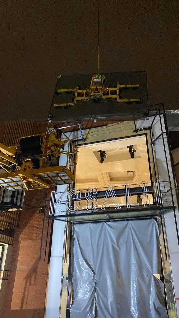Pose du double vitrage GPS de 4x3 m et de près d’une tonne.