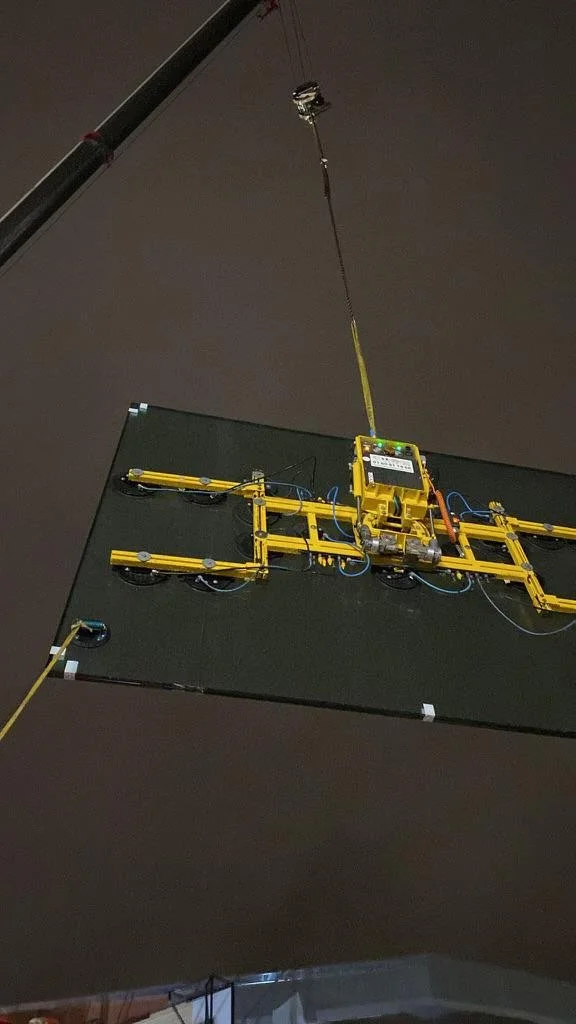 Levage du double vitrage GPS de 4x3 m et de près d’une tonne.