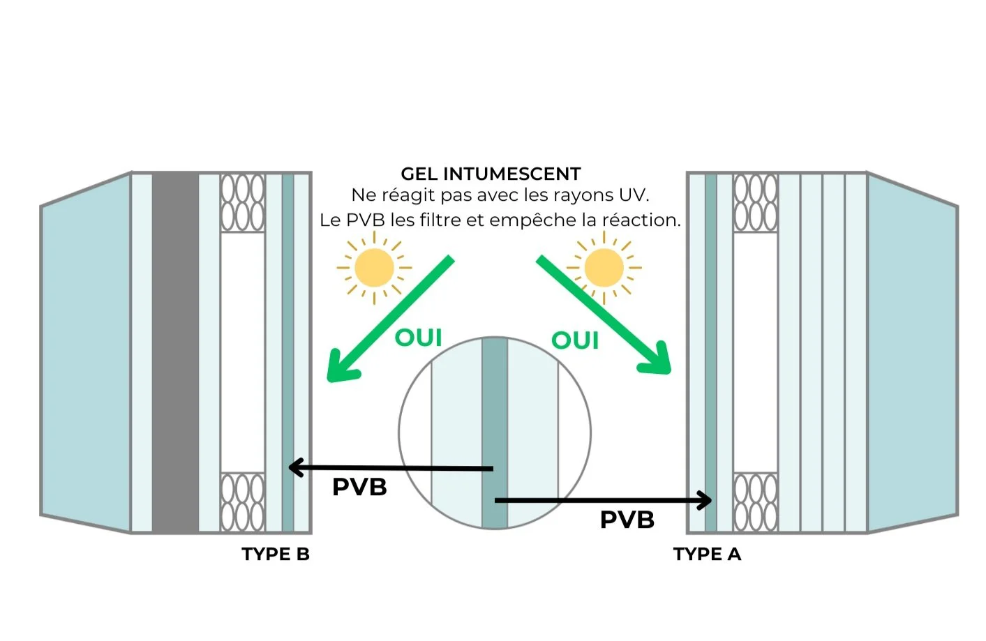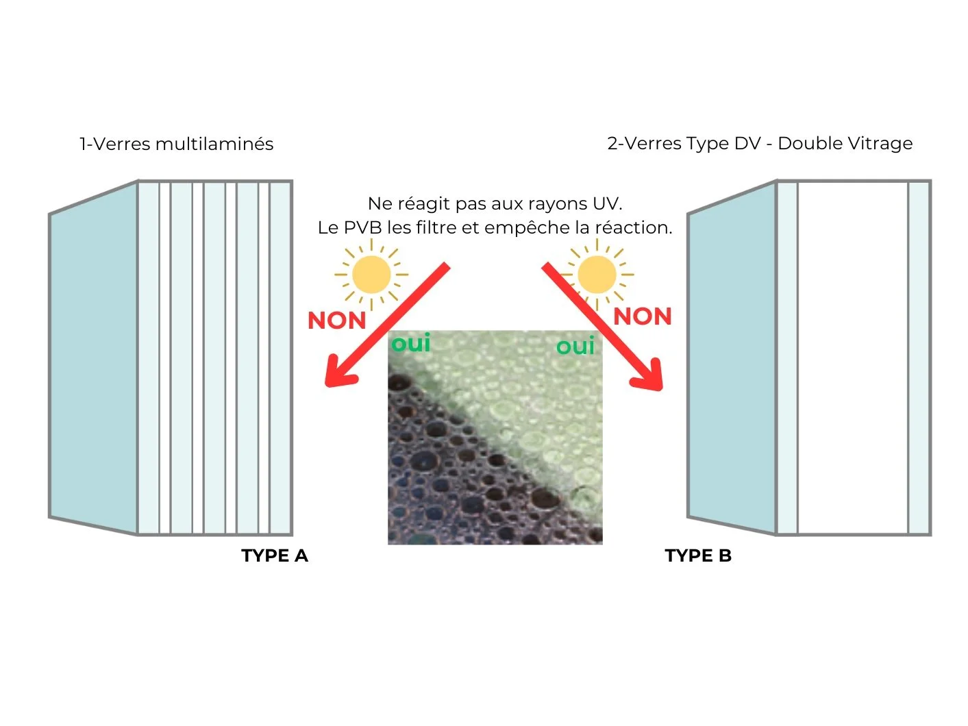 IMPORTANT : Dans les deux cas, ILS NE DOIVENT JAMAIS être exposés directement au soleil, car ILS NE CONTIENNENT PAS dans leur composition un élément tel que le PBV qui filtre les rayons UV. SI vous placez un vitrage RF intérieur dans un endroit exposé au soleil, IL SE REMPLIRA DE BULLES très rapidement.